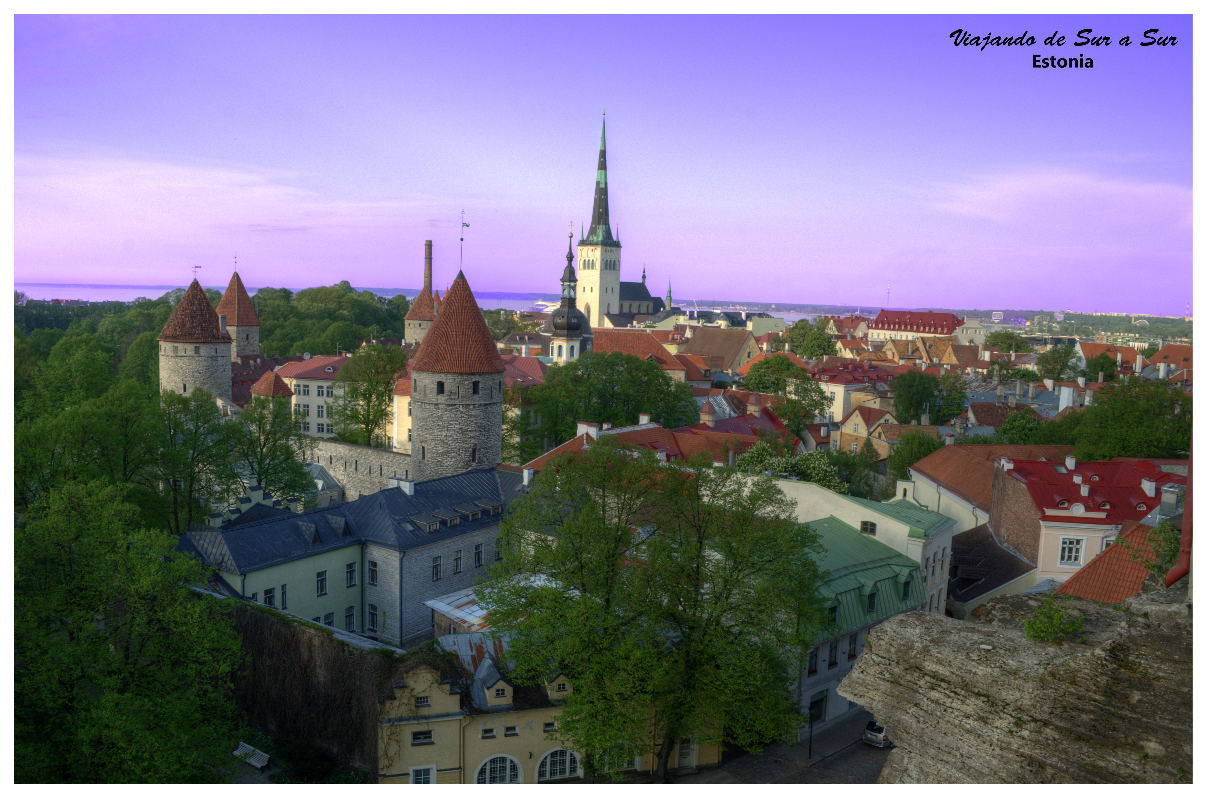 Panorámica de Tallinn, se puede apreciar la muralla en la zona izquierda, con las torres. Del lado «de afuera», los arboles