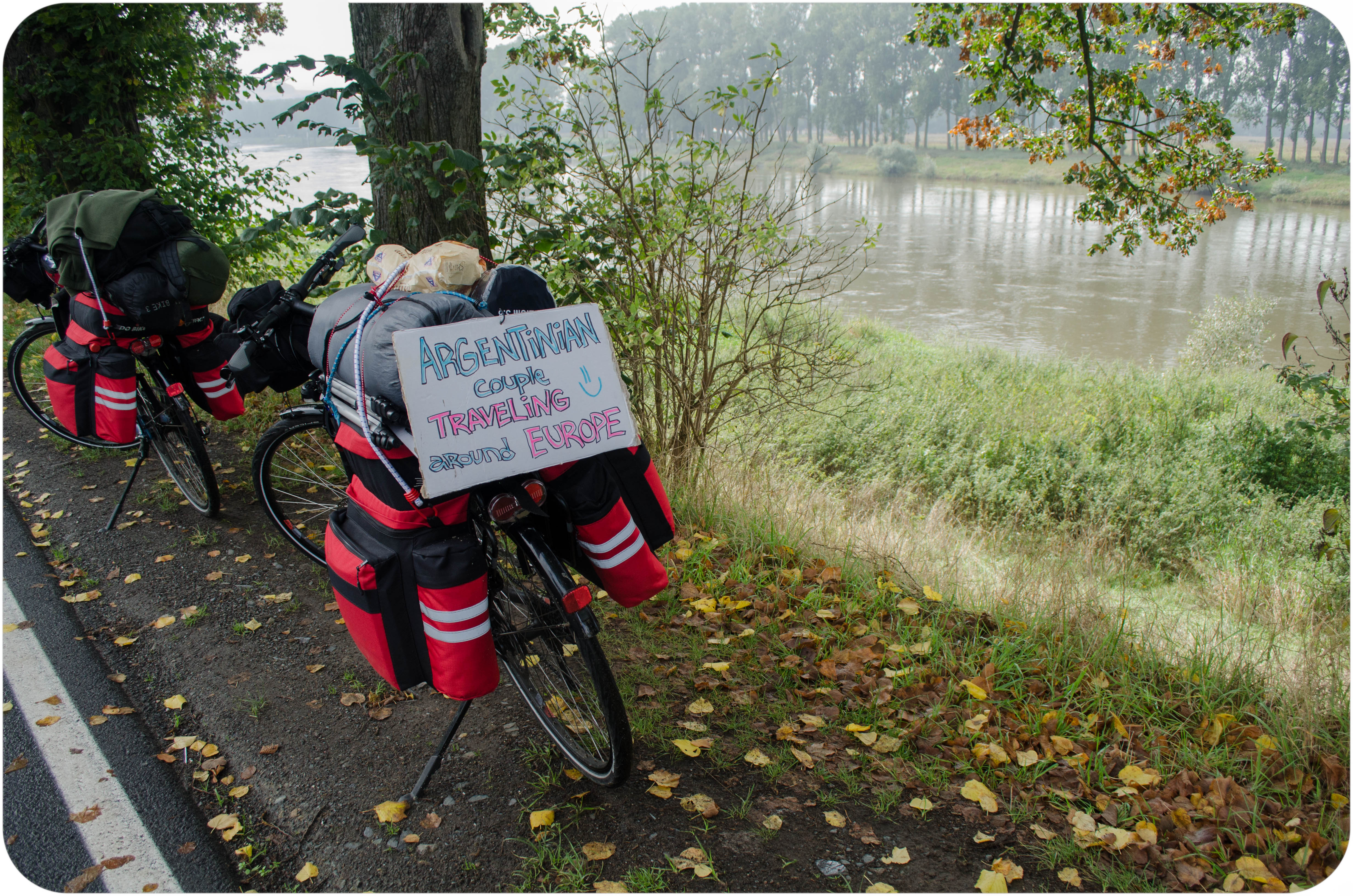 Nuestras bicis cargadisimas al costado del Rio Elba