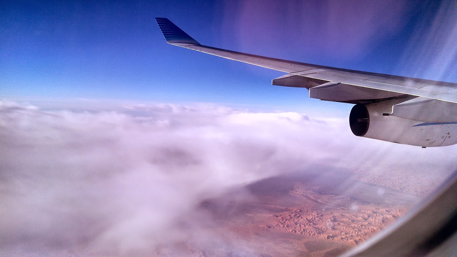 El domingo 9, a la madrugada, nos avisaron que el vuelo estaba retrasado. Así que después de la cancelación, tuvimos una demora, y después, otra demora sobre esa misma demora. A mi dame de Frambuesa de ahora en más, no quiero más de Mora. Finalmente a las 03:40 de la madrugada salió nuestro avión. Del viaje de 13 horas quiero resaltar lo fantástico que es ver el desierto desde el cielo, realmente un espectáculo. Durante aproximadamente 4 horas (viajando a 850 kmh) lo único que se veía abajo eran dunas y terribles porciones de arena. Es increíble.